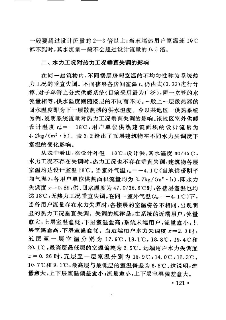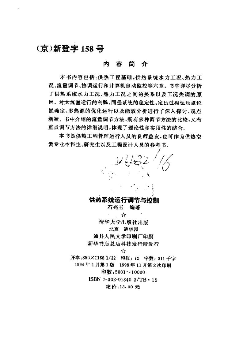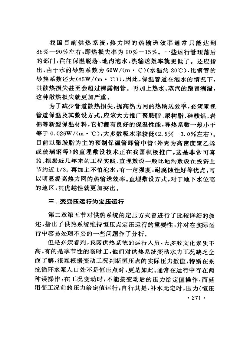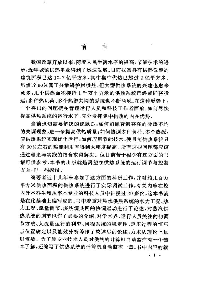 本书内容包括:供热工程基础供热系统水力工况、热力工况、流量调节协调运行和计算机自动监控等六章。书中详尽分析了供热系统水力工况热力工况之间的关系以及工况失调的原因。对大流量运行的利弊、同程系统的稳定性定压过程恒压点位置确定、多热源的优化运行以及能效分析进行了深入探讨,观点新颖。书中介绍的流量调节方法,既有多种调节方法的比较,又有重点调节方法的详细说明体现了理论性和实用性的结合。本书是供热工程管理运行人员的良师益友,也可作为供热空调专业本科生、研究生以及工程设计人员的参考书。